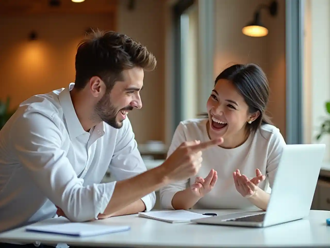 モダンで明るいインテリアの中で、2人の若い大人がスタイリッシュでミニマルなテーブルで熱心に議論しました。. 爽やかな白いシャツを着た男性は少し前かがみになってデジタルデバイスを指さしていたが、カジュアルな白いシャツを着た女性は表情豊かにジェスチャーをし、情熱的な表情を浮かべていた。. 温かみのある木の色合いとモダンな照明が特徴的な背景は、プロフェッショナルでありながら魅力的な雰囲気を醸し出しています。. ノートパソコンといくつかのノートが机の上に置かれ、彼らが協力している学術的な雰囲気を追加しました。. このシーンは、チームのコラボレーションと創造性に共鳴し、アイデアを結びつけて共有する瞬間を捉えています。.