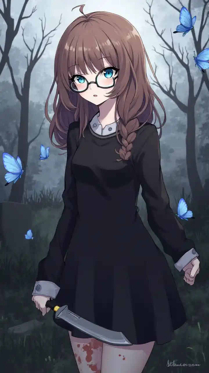 アニメ,長い茶色の髪,青い目,メガネ,ナイフ,血まみれの黒服, 1 girl,白い肌,縄,墓地,ブルーバタフライ,不気味な