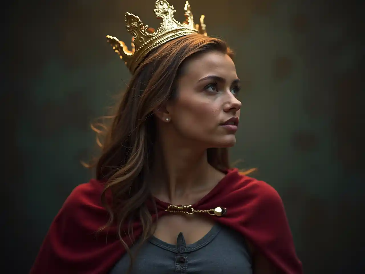 王冠とマントを身に着けた英雄的な女性が見上げる、劇的な光、