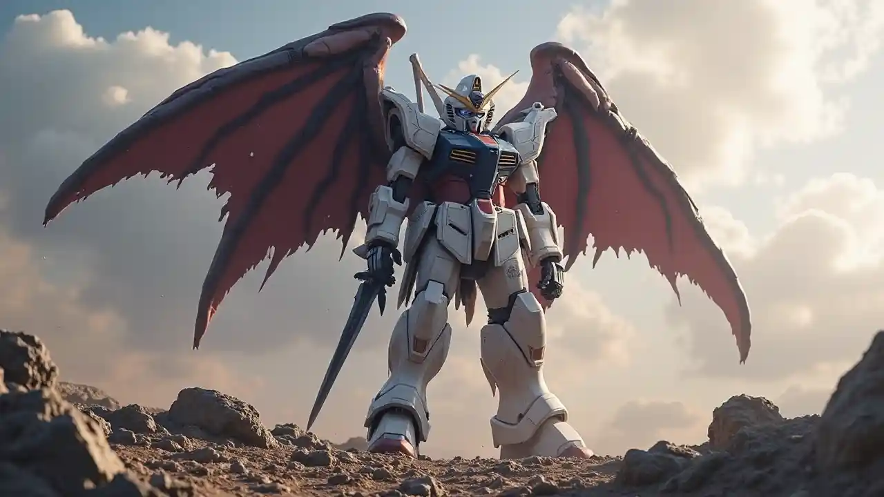 触手の翼と剣の騎士の姿をしたクトゥルフのガンダムは、戦死した敵に囲まれた何もない岩場に立っている