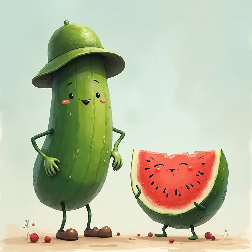 小柄なキュウリの腕と足を寝取られた写真、そしてスイカが入隊しようとしています。.