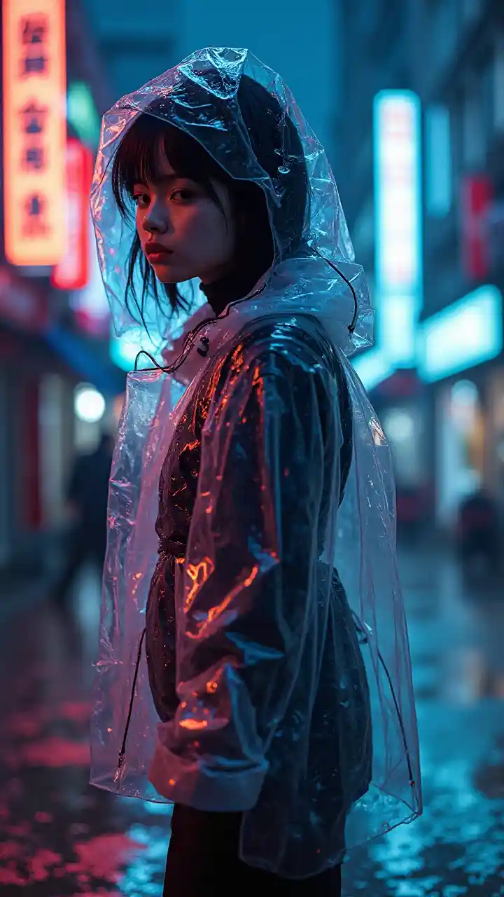 透明なレインコートを着たサイボーグの女の子、サイボーグのパーツ、雨の日の暗いネオン東京の写真撮影、サイバーパンク、鮮やかな色、高コントラスト、コントラストライト