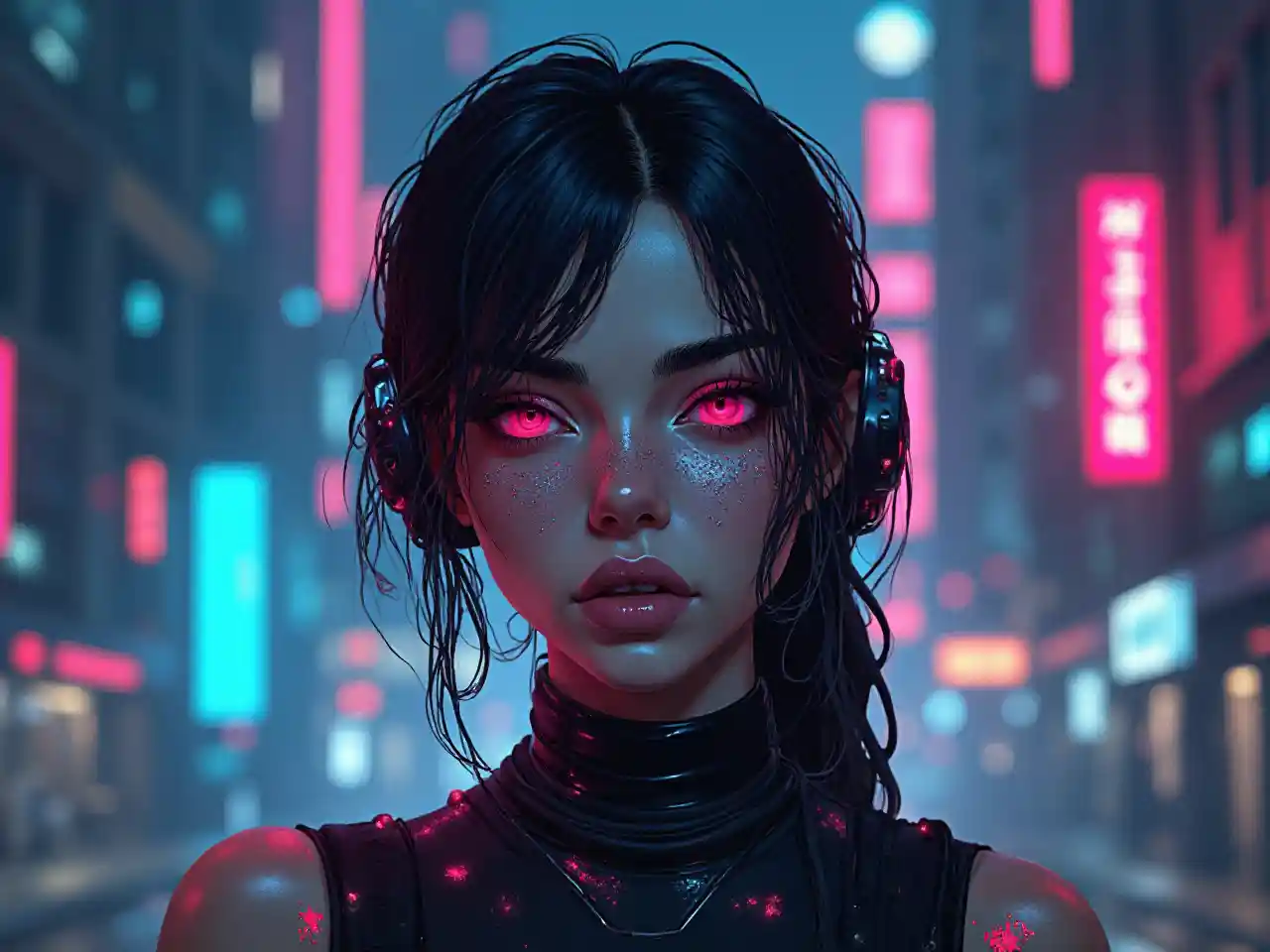 ネオンに照らされた街の反射に囲まれたサイバネティック・インプラントを持つサイバーパンクの女性、ジェームズ・ジーンのスタイルで描かれたイラスト