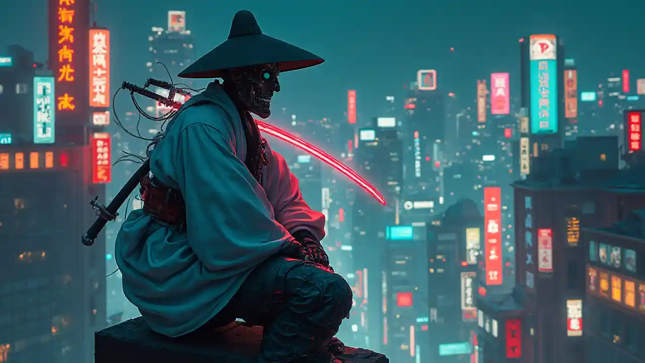 未来的なサイバーパンクのポスターは、風になびく白い着物を着たサイボーグ戦士、スロープマスクと大きな円錐形の帽子、機械的な四肢、肩に光る刀を持ったサイボーグ、危険、神秘的、不気味、赤、シアンの光、夜の街の上の棒の上にしゃがむ、街はゆるいワイヤー、広告、ホログラムで満たされ、背景は印象的なコントラスト、日本の文字、 テキスト" Kanshi "三分割の法則,偉大な構成,アニメ,サイバーパンク,グロー,ダーク,シンメトリー,エレガント,