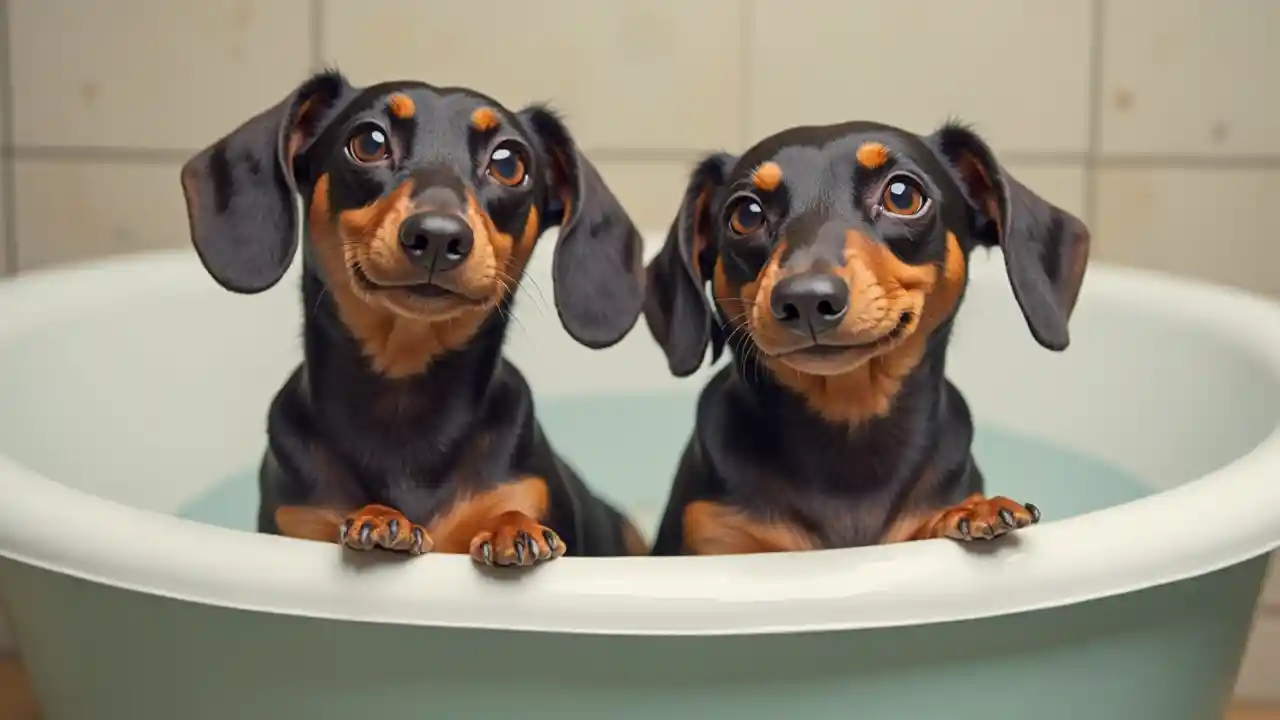 2匹のダックスフンドがバスタブに座っている