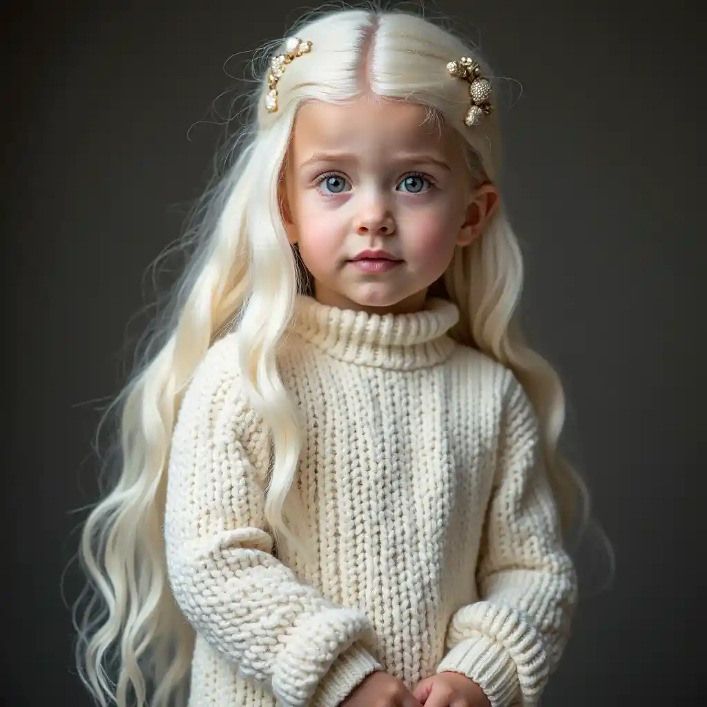 非常にかわいい少女デナーリス・ターガリエン、プラチナブロンドの長い髪、ウールの白いニットウールのニットとパンツ、3歳の子供、衣装モデルの写真