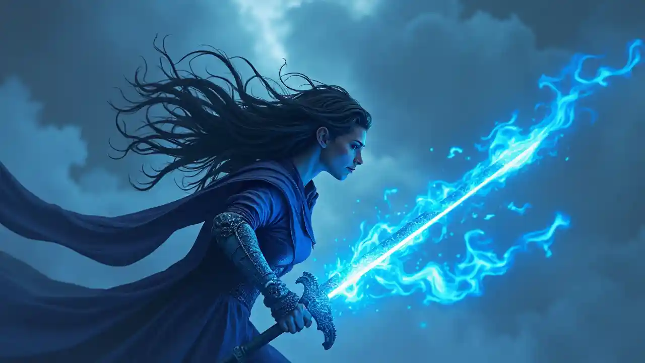 美しいダークエルフが青い炎の中で彼女の剣で空から攻撃します。.