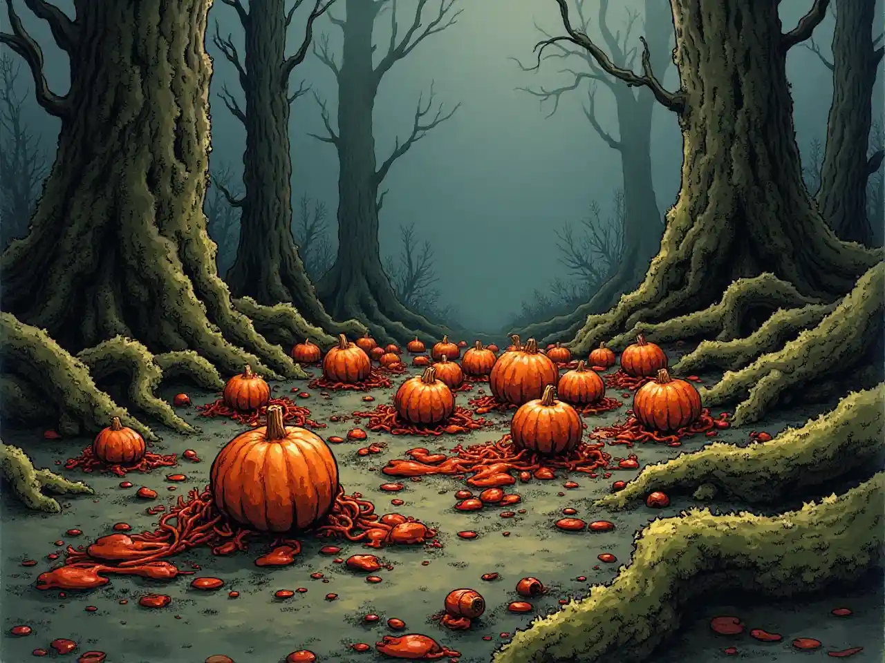( (接写された非常に小さい、平らなカボチャの種) )、濃い赤色の液体と絡み合ったオレンジ色の果肉の中に散らばり、低渦巻き霧の下で苔に覆われた森林の地面に横たわっています。. 周囲の木々はゆがんでむき出しになっており、次第に陰気で暗い背景になっている。. ::ダークファンタジーホラーイラスト::インクとグラファイトスケッチスタイル:: ((手描きの外観))ジェラルド・ブロム、イアン・ミラー、ズジスワフ・ベクシンスキーによる:: (((粘り強いテクスチャー))):(((ムーディーな雰囲気))::不気味、古い、不自然