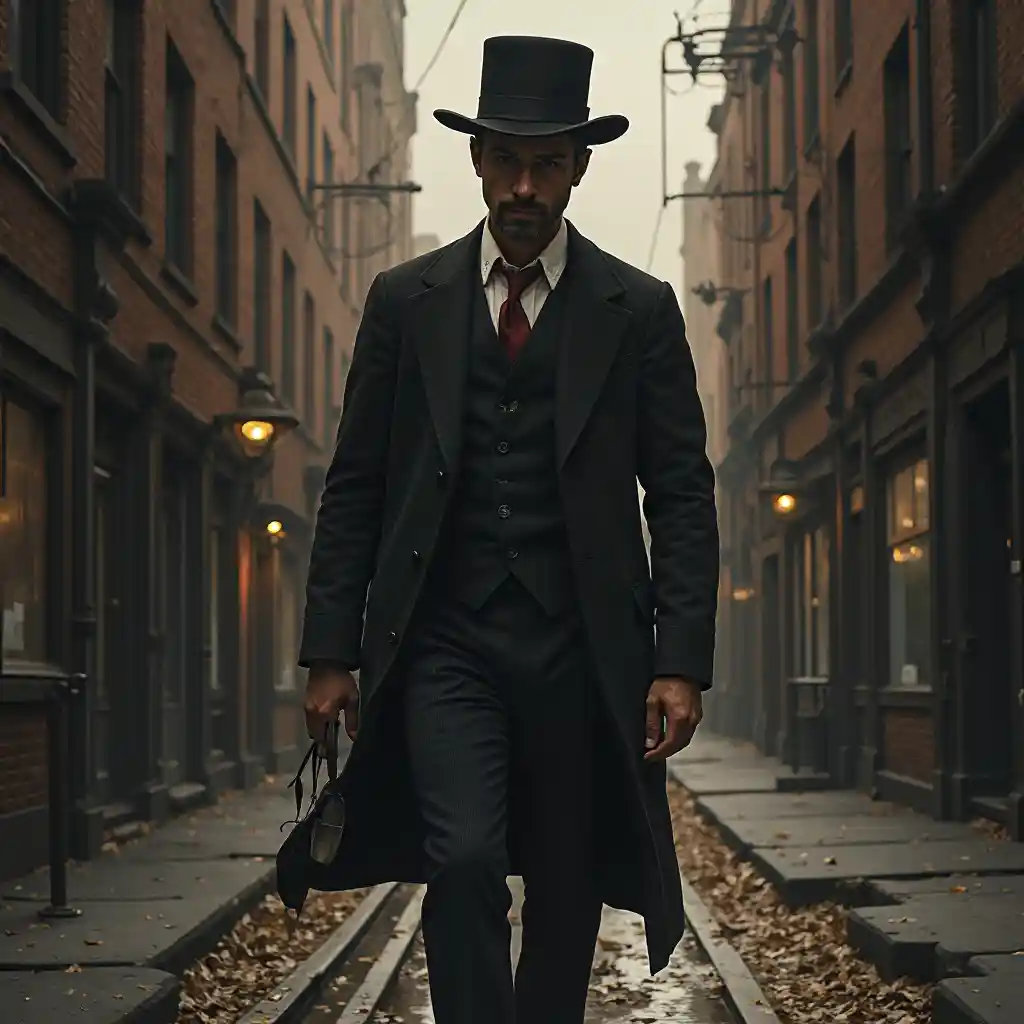 H. H.ホームズがシャープなスーツを着てさまよっていたシカゴの街に戻り、彼の滑らかなセールストークで潜在的な被害者を魅了しました。. あなたのユニークなスタイルを使用して、この悪名高い連続殺人犯の暗い影を示唆しています。"