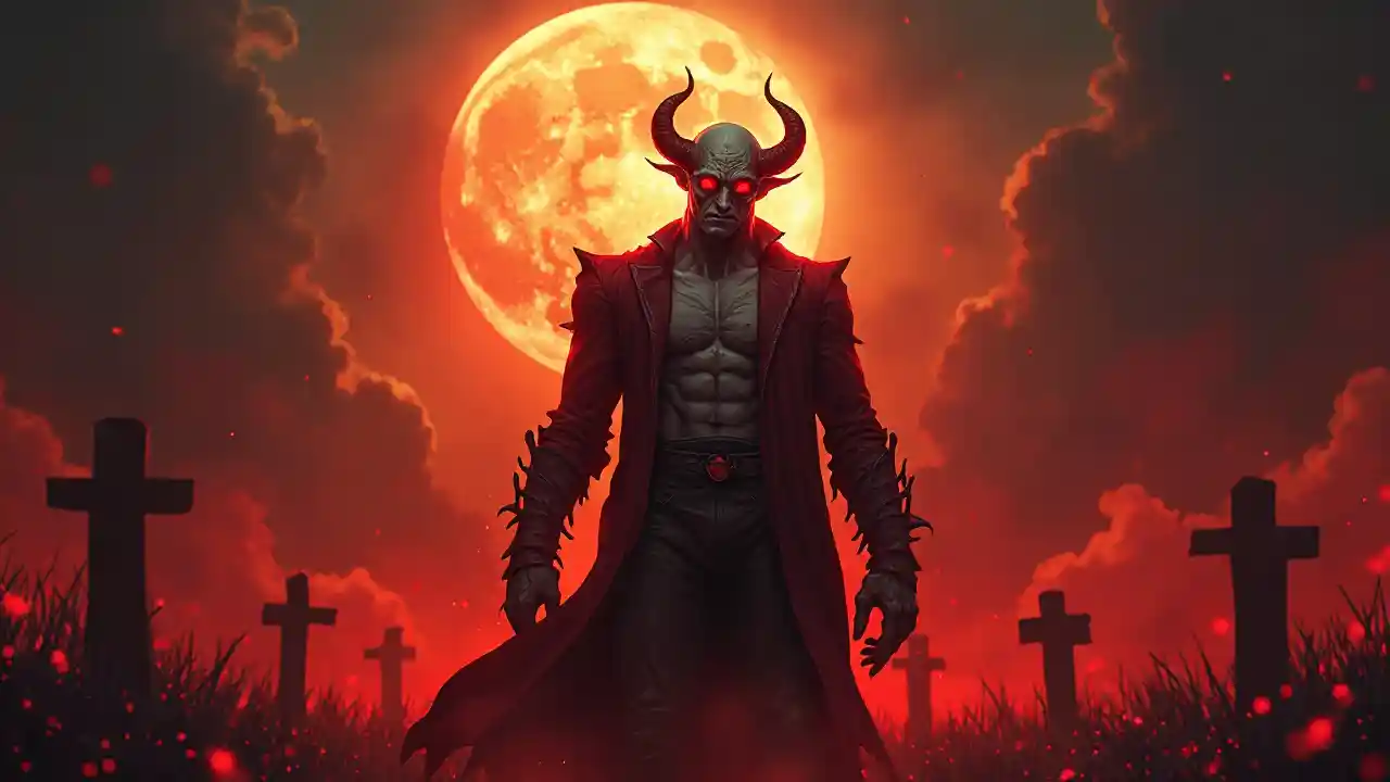 悪魔の駅は燃えている、髪のサングラスをかけ、赤いliqquidを身に着け、満月を背景に、墓がいたるところにあり、悪魔は恐ろしい禿げ頭でなければならない