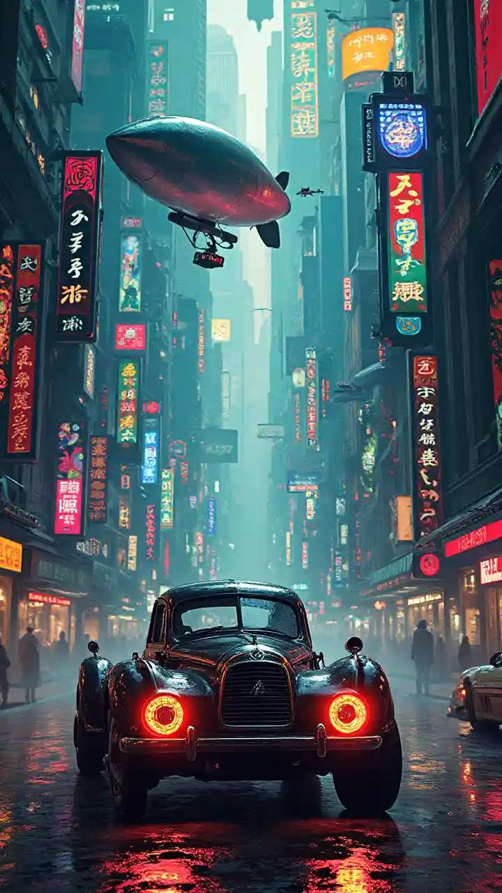 (サイバーパンクゲームスタイル)、鮮やかな色、(クラシックカーに対抗する未来的な都市景観)、カンディンスキーの抽象的なフォームに触発された、クレースタイルを反映したダイナミックなパターン、クリムトを連想させるゴージャスな要素、浮遊宇宙船、ネオンライト、ハイテク要素、(シュールな雰囲気)、複雑なディテール、超ディテール、4 K解像度、没入的な雰囲気、想像力豊かなデザイン、デジタルアートの傑作。.