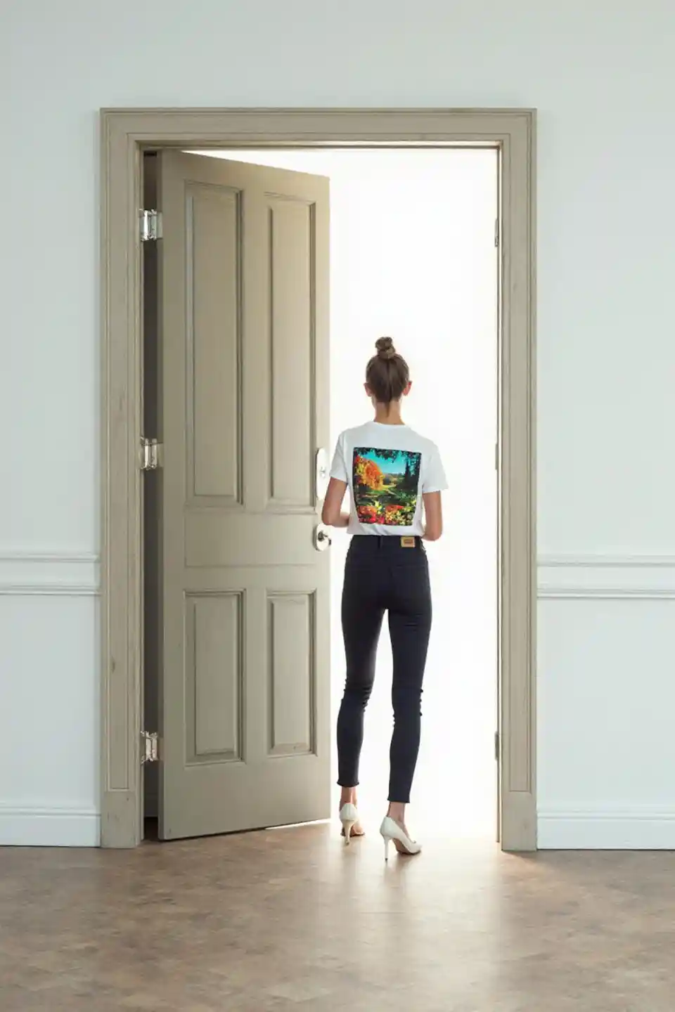 白い背景に描かれた自然のシャツを着て、黒のレギンスを着て、白いハイヒールを履いている女性は、thで開いている巨大なドアを見ています