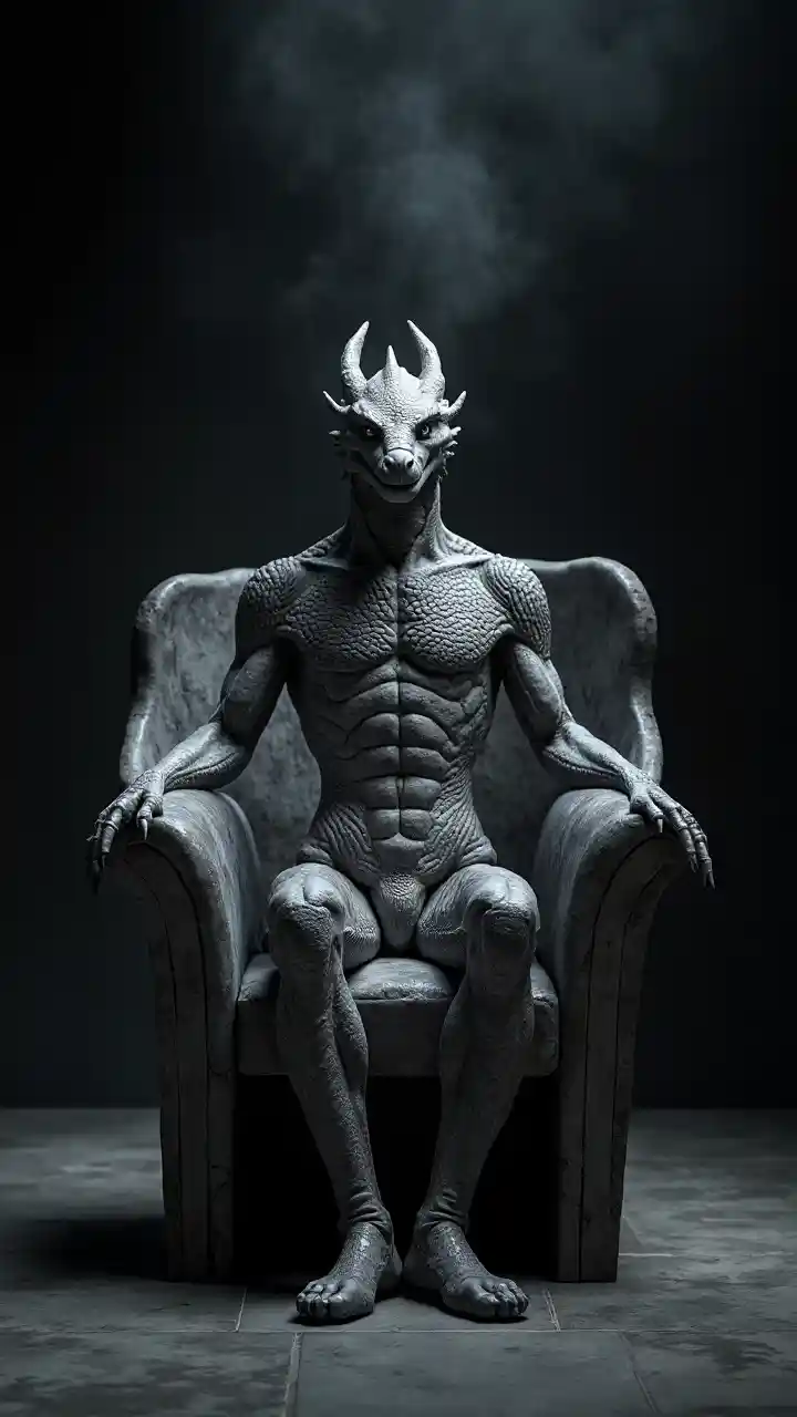 超現実的な写真,美しい現代の石の椅子に設定された煤のドラゴンのような王,スタジオ撮影,黒の背景,ドラマチックな光,超現実的な,超詳細