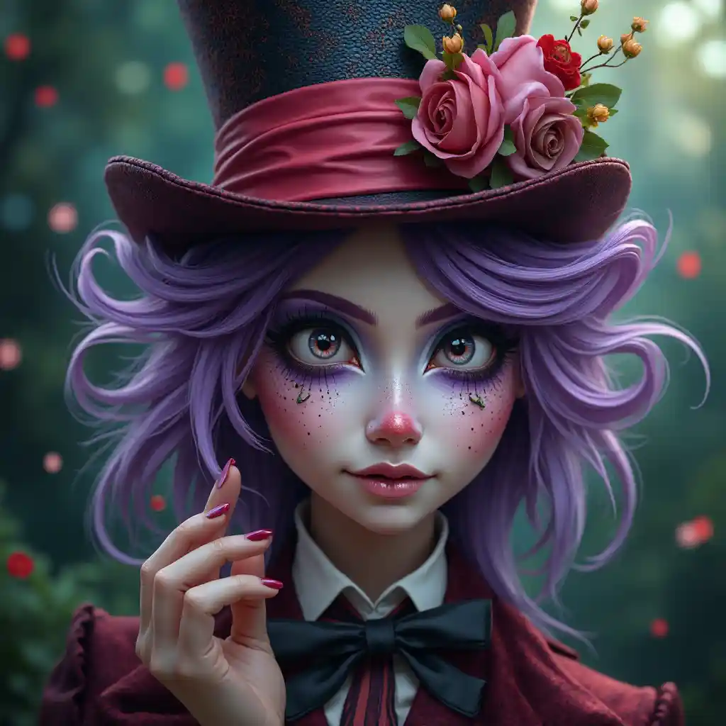 マッドハッターお茶会不思議の国シルクハットグロテスクファンタジー不思議の国のアリス不思議な好奇心旺盛なキャラクター,紫色の髪,鮮やかな,彩度の高い色,エレガント,高度なディテール,ファッション,ファッション誌, exentricメイクアップ,シャープフォーカス,劇的な照明,浅い被写界深度,信じられないほどの高ディテールぼかし背景,プロのデジタルペインティング,コンセプトアート