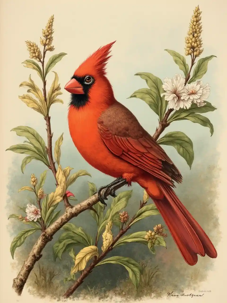 エドワード植物油絵、受動的な植物に囲まれた枝に赤いカーディナルバードのイラスト