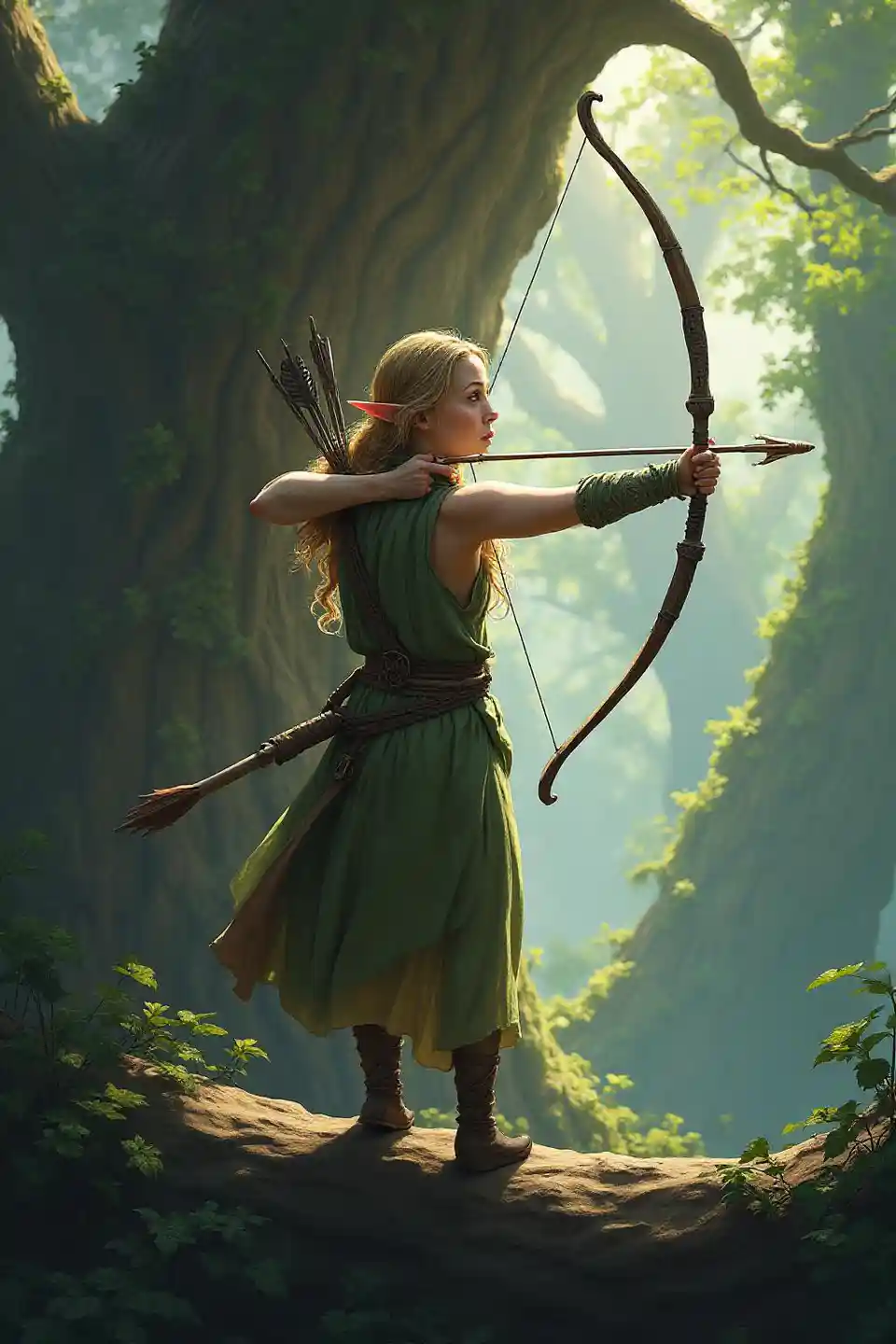 エルフの女性は、巨大な弓をつかみ、矢の弓と尾をつかみ、それをしっかりと引っ張って狙い、大きな木の太い枝に何かを着ていることを目指します