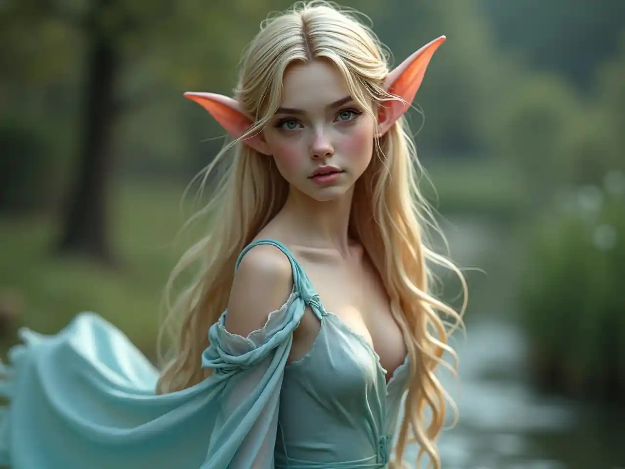 金色の長い髪に絹のような透き通った水色のドレスを着た女性精霊。. 写真はリアル、8 k、超高精細。. 魅惑的な姿勢。. 全身を撃たれる。. 自然採光。. 被写界深度が浅い。.