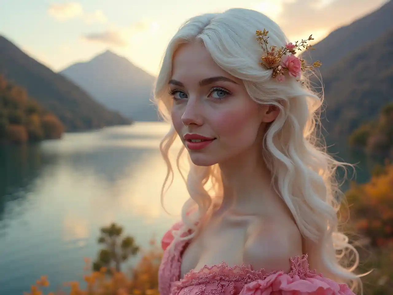 白い肌、深い青、大きな青い目、明るい赤の光沢のある唇、そして長い美しい白い白金の髪を持つ美しいシュールな女性は、輝く金色の花でデザインされた開いた髪に完璧にセットされています。彼女は美しい濃いピンクのレースアップのドレスを着ています。スカーフの襟とベルベットのローブ、微笑み、シュールな背景、金色の太陽の光の幻想的なdrwan風景が静かな湖の上に重ねられています。 ピンクとオレンジで空を―・る。. 雄大な山々が遠くで見張りをしていて、生き生きとした枝葉が点在していて、そよ風が木々の間でささやいている。. 4 K HDワイドアングルで完璧なポートレートを撮影。.