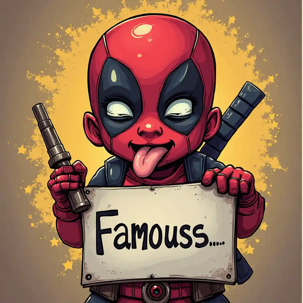 Baby Deadpoolは舌を突き出し、バンドスタイルにキスをします,長い舌,芸術,レイトレーシング,「Famousss」と書かれたスローガンを保持します