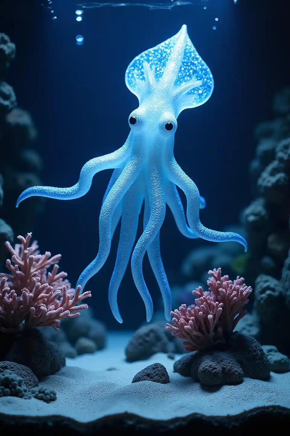 ((ダークファンタジーでイカの反射生物を想像してください: 1. 4)))、((きらきら輝くサンゴと砂浜でいっぱいの水槽できらきら: 1. 3)))、((t