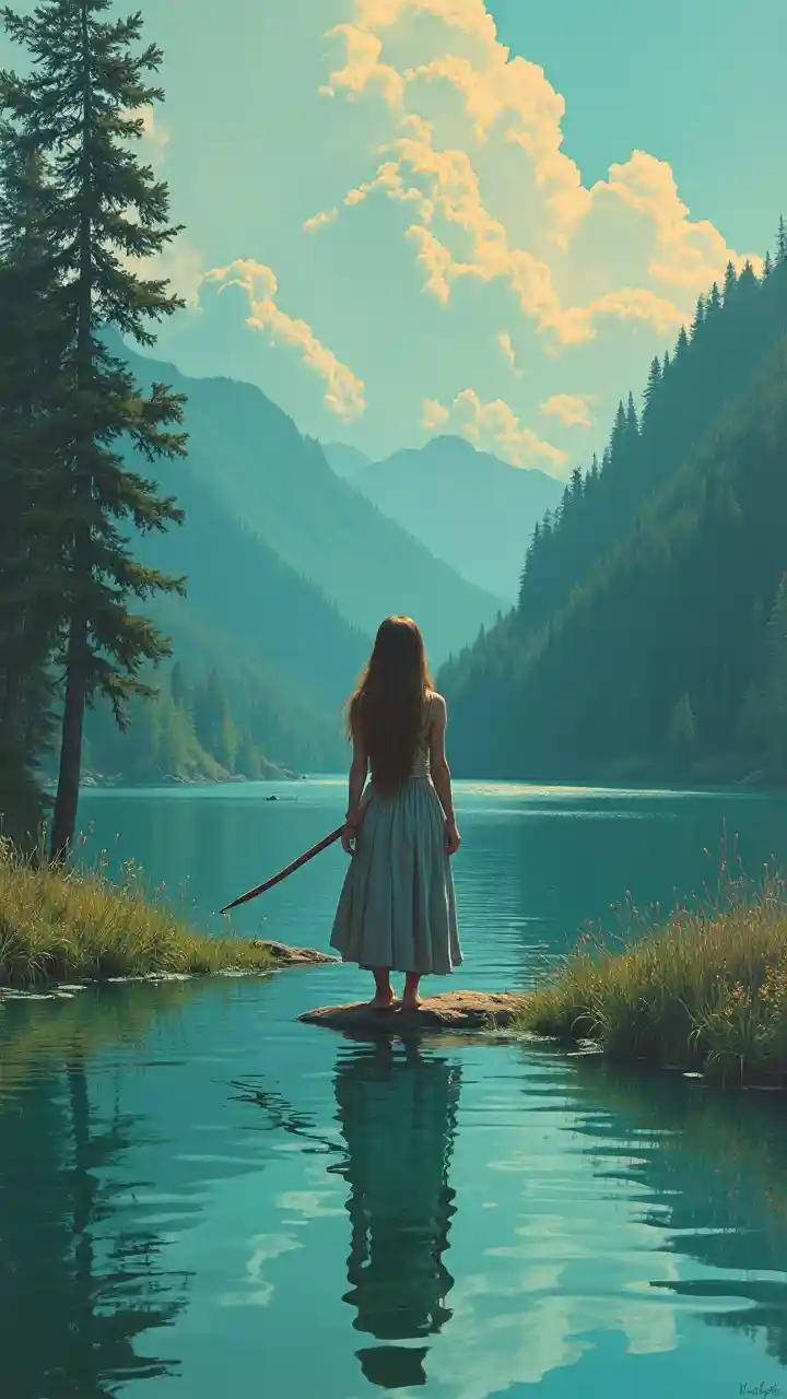 湖の美しい露骨な少女,ミニマリズム, 1970年代のダークファンタジーブックカバーペーパーアート,ダンジョンズとドラゴンズスタイルの絵画,ラリー・エルモアによる