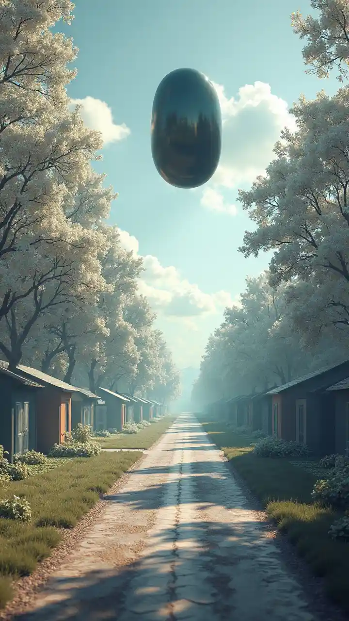 道の片側には一列の白い木が生えていて、道の反対側には小さな家が並んでいるブロックだ。. 楕円形の黒いガラスの飛行物体が空を飛んでいた。. 不思議な光。. 3 Dファンタジー。. シュルレアリスム調。. スーパーディティール。. さまざまな色の太陽の光。. 影。.