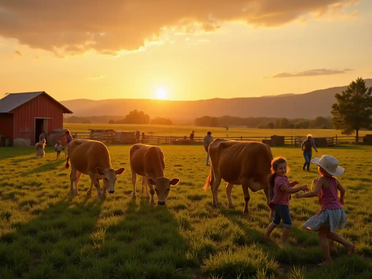 太陽が遠くの丘の後ろに沈み始めたとき、金色の光が広く開けた農地を照らし、空をオレンジ、バラ、柔らかい紫色で描いた長い影を落としました。. 前景では、優しい牛が濃い緑の草の上で静かに草を食み、尻尾をだらだらと振っている。. 子供たちは笑いながら裸足で野原を駆け抜け、干し草の山と低い木の柵の間で追いかけっこをした。. 近くでは、農民たちが地道に働いていました。1人は作物の世話をし、もう1人は道具の束を運んでいました。. 赤い小さな納屋が,遠くに誇らしげにそびえ立っている。. 空気は暖かく穏やかで,土と干し草の香りが立ちこめている。.