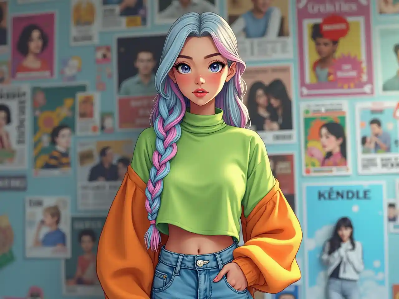 長いパステルカラーのレインボー(ブルー、ピンク、プラチナ)のヘアアレンジをした美しい若い女性は、パステルカラーのヘアカラーに合わせたトレンディなターバンを身に着け、短いネオングリーンのトップスにオーバーサイズの鮮やかなオレンジの袖を合わせ、ハイウエストのジーンズを履いています。. 彼女は雑誌で埋め尽くされたカラフルな壁の前に自信を持って立っていた。. 柔らかい照明、半現実的なアニメスタイル、非常に詳細な顔、滑らかな肌、スタイリッシュで美しい外観、柔らかい雰囲気、カジュアルなストリートウェアのヘッドカバーのファッション。.