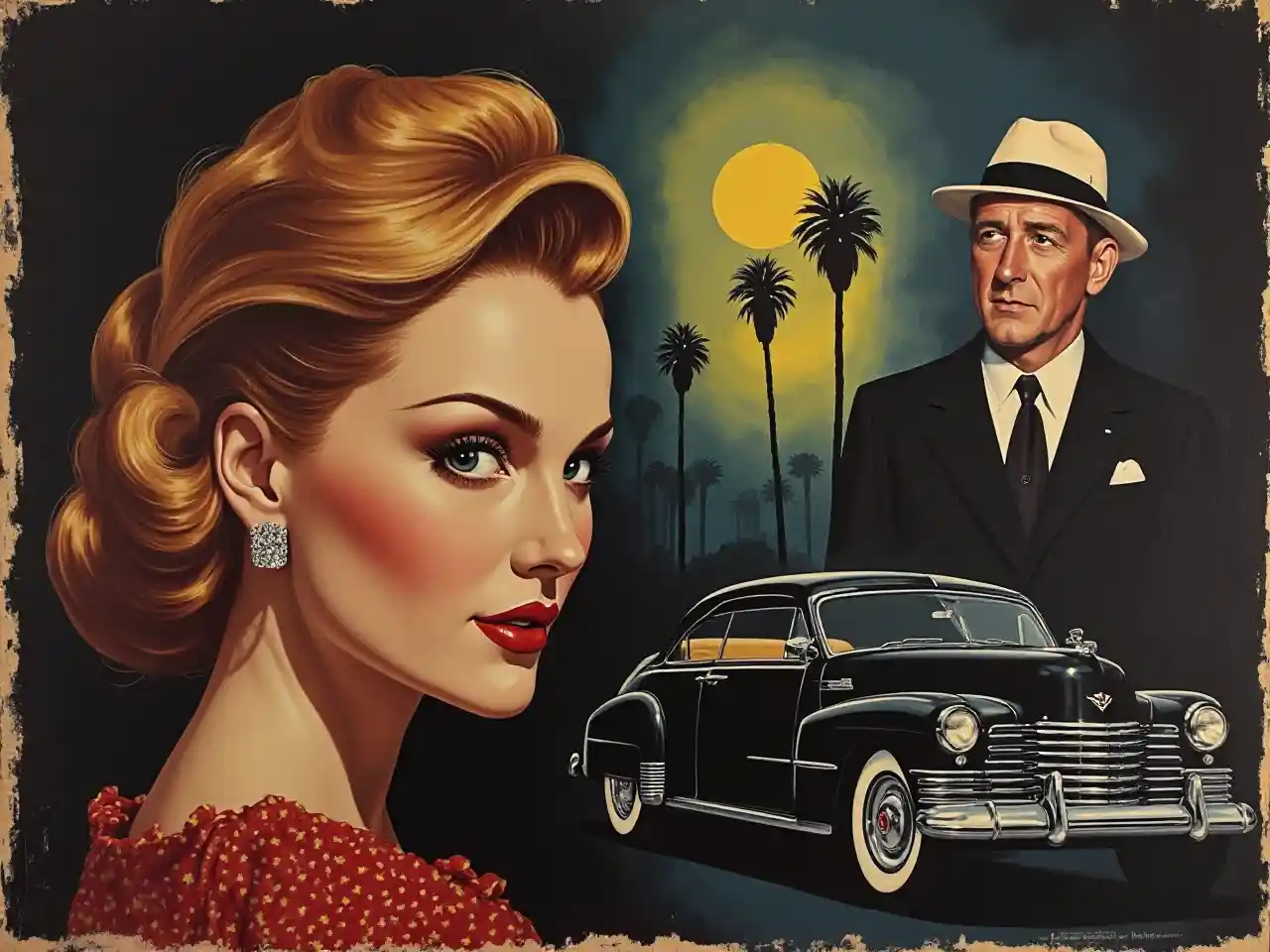 ハリウッド1940年代フィルムノワールポスターコラージュ、グラマラスな女性、ハンサムなスーツの老人、マフィア、キャデラック、スポットライト、映画、ヤシの木。.