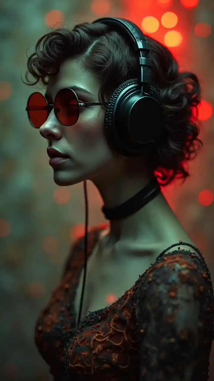 1910年代の超現実的な抽象画像、ヘッドフォンを着用した1910年代のフラッパーダンサーのアンドロイドモデル、アンセル・アダムスのスタイル、暗いが鮮やかな