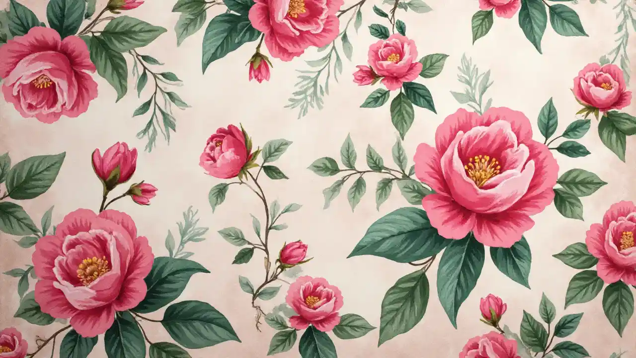 ピンクの花と緑のエレファントトーンベッドカバーのファブリックデザイン