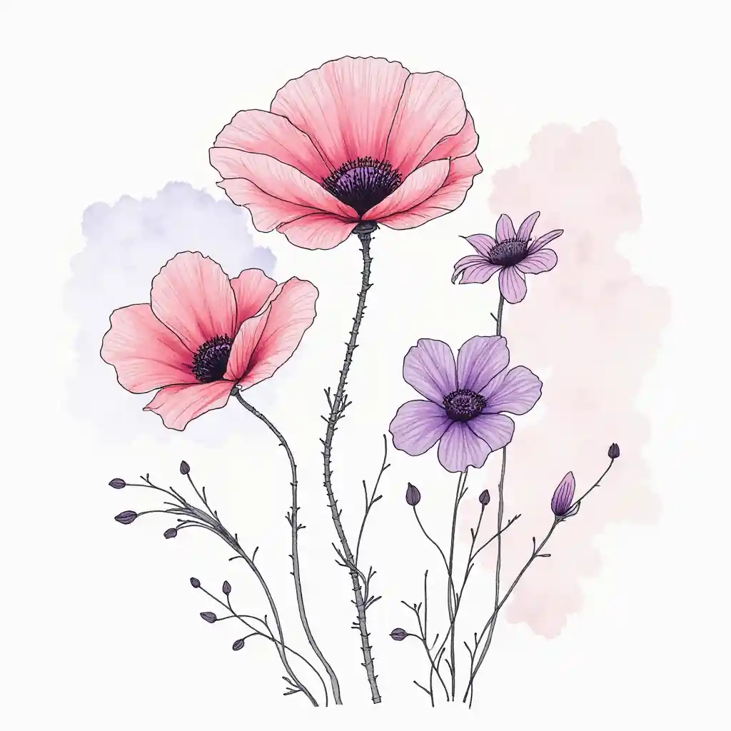 花スミレ、ポピー、グラジオラス、プリムラを使用したミニマリストの線画は、飛び散ったピンクの容器の色で描かれています