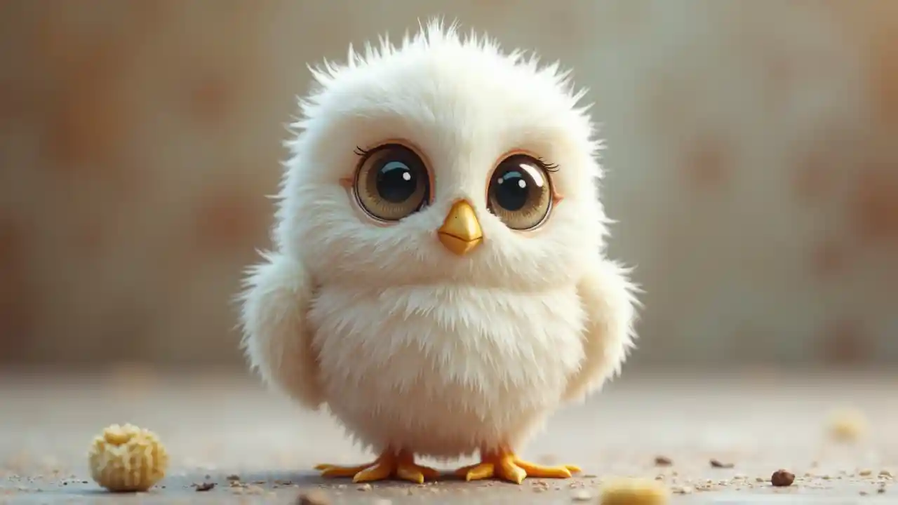 かわいいフクロウのひよこを作成します。かわいい目、カメラの前で笑う白い羽を見て3 D