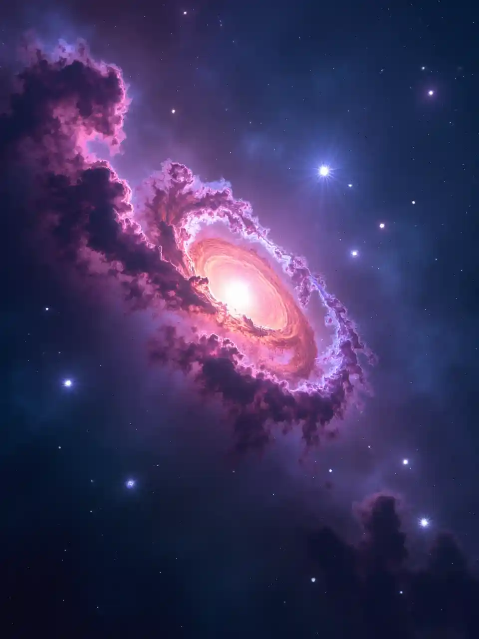 grace暗い紫、ピンク、青の色調で回転する星雲を示す、鮮やかな銀河の素晴らしい写真。. 星は広大な宇宙空間で瞬き、宇宙のキャンバスの中で複雑な星座を形成しています。. 天の川銀河の中心部から光が放たれ、周囲の暗い空間の空虚さへと薄れていく。. 画像は、壮大な色の爆発と宇宙の静けさと広大さの間の微妙なバランスを捉え、驚きと無限の可能性の感覚を呼び起こします。.