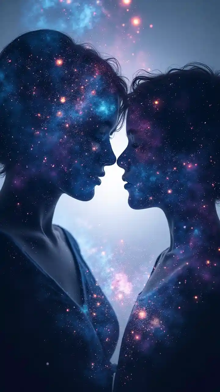 Ava母と子が互いに見つめ合うシュールな二重露光で、その輪郭は銀河、星、星雲、星座で満たされ、母と子のシンボルを形成しています。. パレット:ミッドナイトブルー、コスモパープル、スターダストシルバー、ブラック、ネオンピンクのヒント。. 気分:宇宙的なつながり、永遠の愛、絆の中の宇宙。.