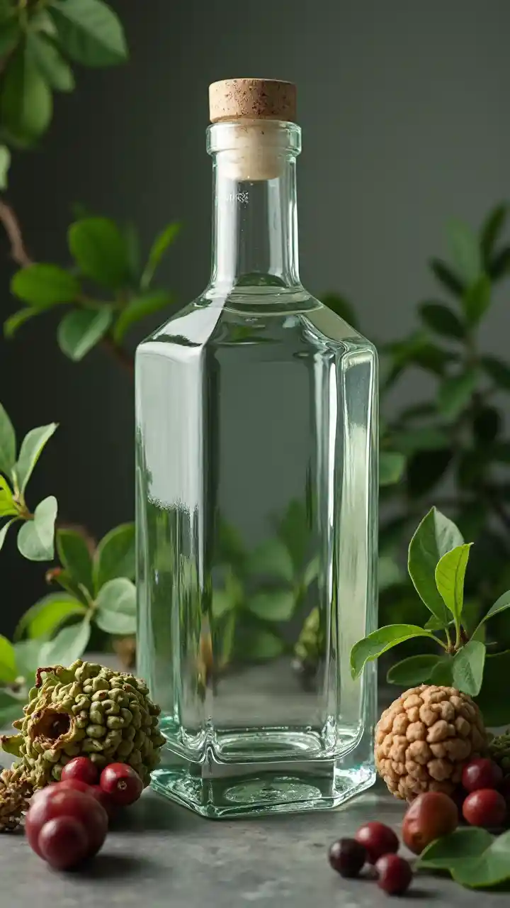 プロの写真正方形のジンボトル、正方形のボトル、1つのジンとジンを囲む、正面からのジンショット、ラベルなし、クリア、プロトタイプ