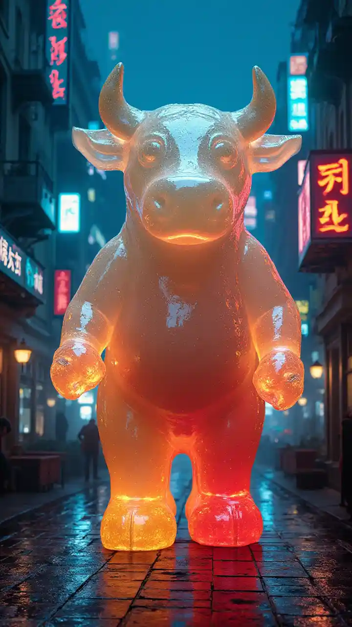 巨大なグミの雄牛、半透明、4階建ての高さ、夜はMEDIEVALシティ、ネオンMEDIEVALシティ、サイバーパンク、テクノシティを歩きます。.