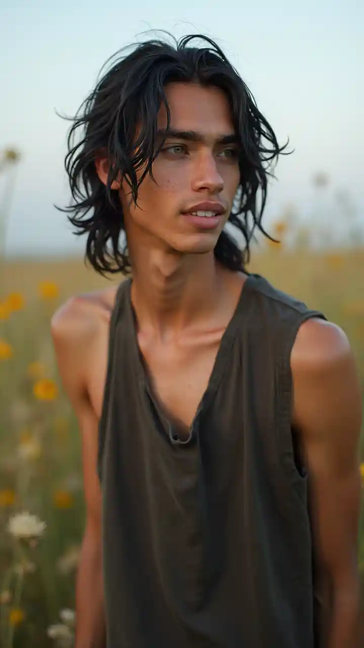 grace18歳の男性の全身写真,スキニー,彼はヒスパニック系です,若いです,瞬く間に,ボディービル,フィールドに立って、カメラを見て彼は雌雄同体の顔の特徴を持っています,長い黒髪,鋭い緑の目,彼は少し微笑んで、カメラの左側を見つめます。.
