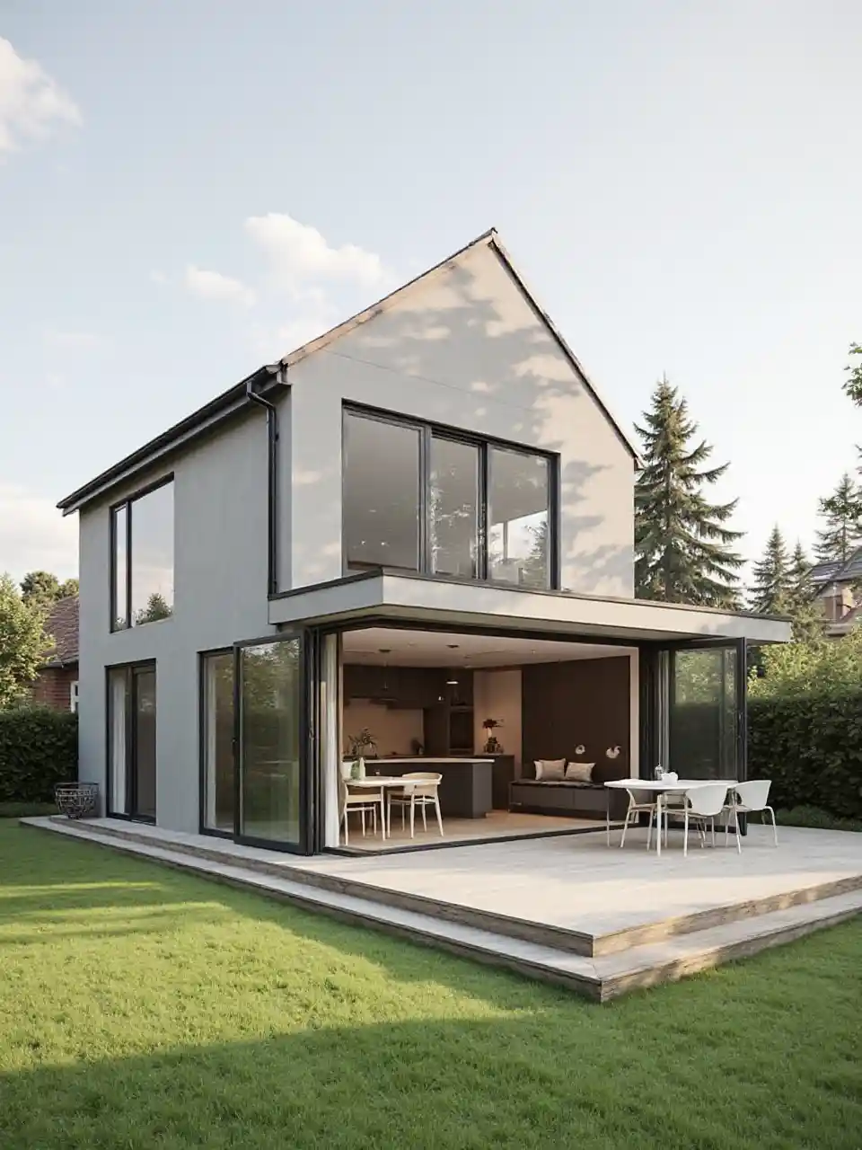 キッチンエリアとガラスの引き戸を備えた西側正面の家の延長設計