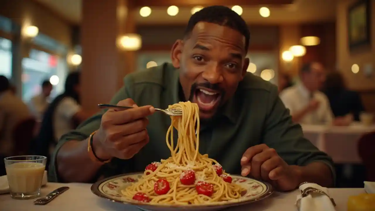 (シーン:ウィル・スミスは活気のあるイタリアのビストロでパスタを味わっています。笑いと料理のジングルが心地よい雰囲気の中で共鳴しています)、(特徴:回転パスタ、聖トマト)、(テクスチャー:すりおろしたパルメザンチーズ、アルデンテパスタ)、(背景:料理の楽しみ、イタリア料理)、(構図:中央のプレート、背景の活気)、(ショット:プレートのクローズアップ、 ウィル・スミスの中央レンズ)、(照明:柔らかい頭の上の雰囲気、キャンドルライトのテーブル)、(色調:暖かい黄色、豊かなトマトの赤)、(大気効果:蒸気が上昇し、ぼんやりとしたキッチンの喧騒)、(スタイル:静物、現実的)。、