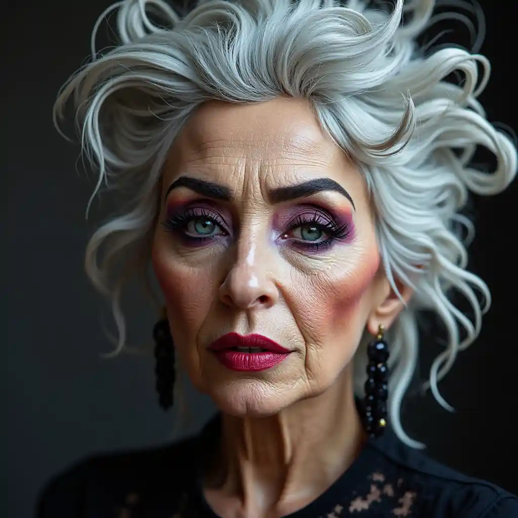 レディー・ガガ90歳の古い歌手、明るく劇的なメイクとワイルドな髪、美しい毛穴と肌質、細部の高解像度画像、白髪、ディオールのメイクアップ、受賞歴のあるファッションエディットイメージ