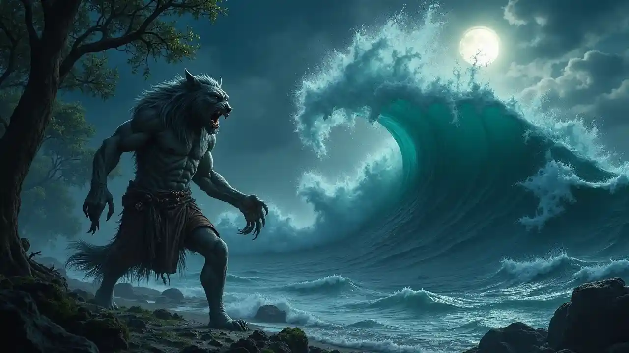 < updated _ prompt > 伝説的なアルカディアの王リカオンが苦しそうに立っている劇的な月明かりのシーンでは、彼の体がねじれてねじれ始めたとき、彼は恐怖で目を見開き、彼の皮膚は厚い灰色の毛皮に変わり、彼の手は鋭い爪に成長しました。. 彼の側では、彼の息子の1人か2人が同様の恐ろしい変容を経験し、彼らの顔は鼻に引き伸ばされ、彼らの恐怖の叫び声が空中に響き渡った。. 背景には巨大な泡のような波が押し寄せ、3人の変身した人間を飲み込むと脅かされている。. 緊張した、不吉な雰囲気、風が森を吹き抜け、近づいてくる波の音が1秒で大きくなる。. シーンの背景には暗い不吉な空があり、まるで自分の命を使って渦巻いているかのような雲があり、神自身がライコンと彼の息子たちに怒りを解放しているかのようです。.