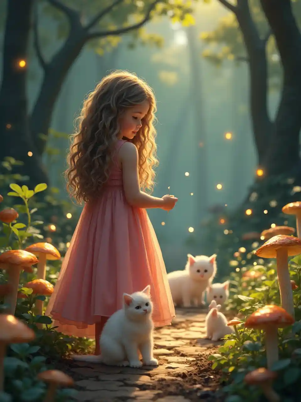 ピンクのドレスを着た少女5歳の長い巻き毛は、黄金の光とホタルのキノコで1匹の白い子猫と魔法の森に立っています