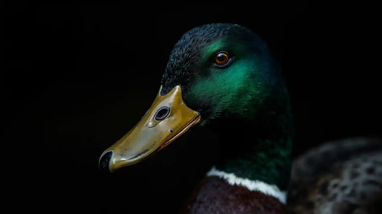 緑の顔全体のアヒル,顔のわずかな白の反射,黒の背景,鮮やかな色,光沢のあるハイライト,プロのショット,明確なディテール,高度なディテール,人間のパイロットの制服の服,
