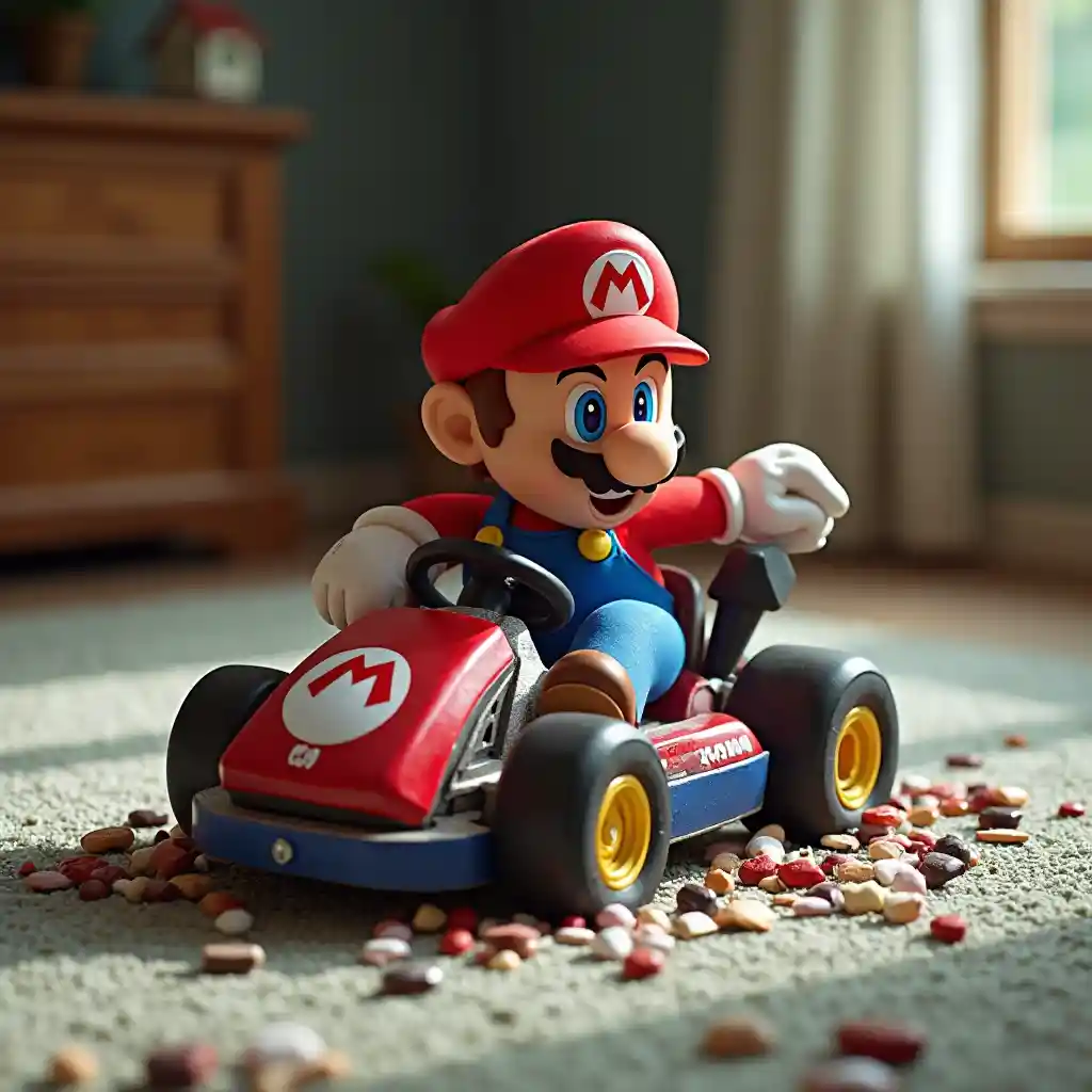 マリオカートを運転しているマリオは、カーペットの床の上で小さな部分に押しつぶされました