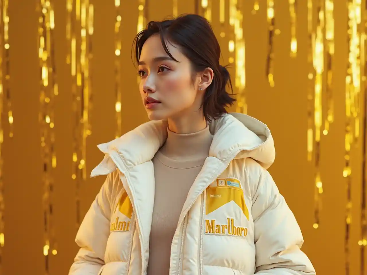 3 Dの女性モデルは、マルボロの金色のタバコのパックのような白いジャケットを着ています,金の背景,豪華な,