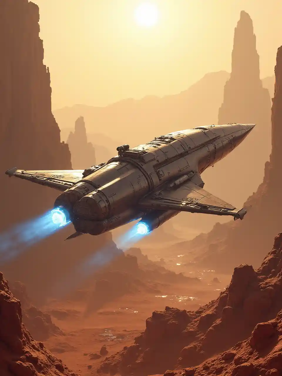 火星の幻想的な風景の中を航海していると、輝く金属の表面と激しい青色の融合エンジンを備えた滑らかな貨物船が、沈んだ太陽が映し出す金色の色合いを背景に進んでいきます。. 広大な地形には、ほこりっぽい地面から劇的に上昇するそびえ立つ岩の層が点在しており、その下にあるガラスのドーム都市は、ドームの生態系技術を示唆しています。. 青い排気ガスは、アリの宇宙船のダイナミックな動きと赤い惑星を探索するスリルを示唆しています。. 構成は冒険と神秘を呼び起こし、視聴者を地球外の環境での宇宙探査と発見の物語に引き込みます。.