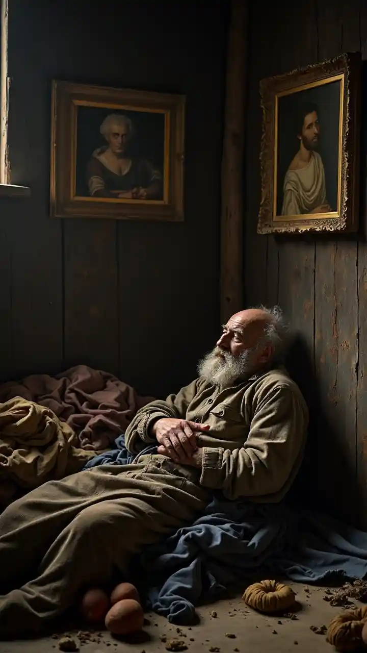 カラヴァッジョとレンブラントの傑作絵画、全体像ひげを生やした老人、苦しんでいる、古い服の山の上に横たわっている、美しい傑作絵画に囲まれている、質素な木造の家で、非常に暗い夜の影にある