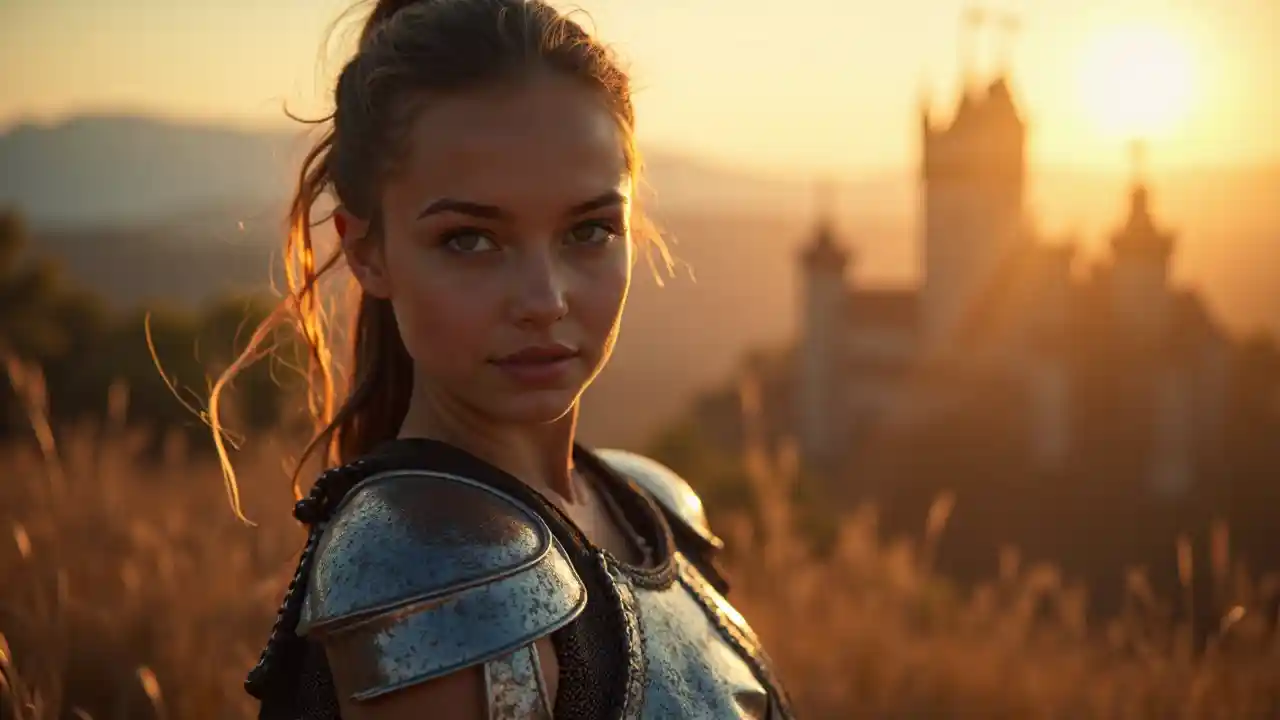 Harrison(代表作)、(非常に複雑: 1. 3 )、(写実的な写真: 1. 2 )、少女の肖像画、世界で最も美しい、(中世の鎧)、(金属反射: 1. 1 )、上半身、屋外、強い日差し、遠くの城、プロが撮影した素晴らしい女性の詳細、鋭い焦点、劇的な、賞を受賞した、映画の照明、ボリューム測定DTX、(フィルム粒子、背景ぼかし、前景ぼかし、ボケ、被写界深度、日没、 アクションぼかし: 1. 3), chainmail