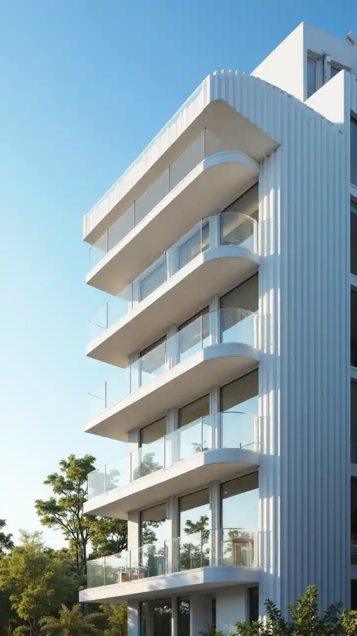 真っ青な空を背景にしたモダンなアパートは、滑らかな白い表面と微妙な垂直パネルを組み合わせたスタイリッシュな建築デザインを示しています。. 建物には、透明なガラスの手すりが付いた大きなバルコニーがいくつかあり、周囲を一望できます。. 大きな窓は自然光を反射し、各ユニットのモダンなスタイルと広さを強調しています。. 窓の配置は、ファサードにリズミカルなパターンを生み出し、構造に視覚的な興味を与え、優雅さと機能性を伝えます。. 全体的なシーンは、活気に満ちた街並みの中で、静けさと現代的な生活感を醸し出しています。.